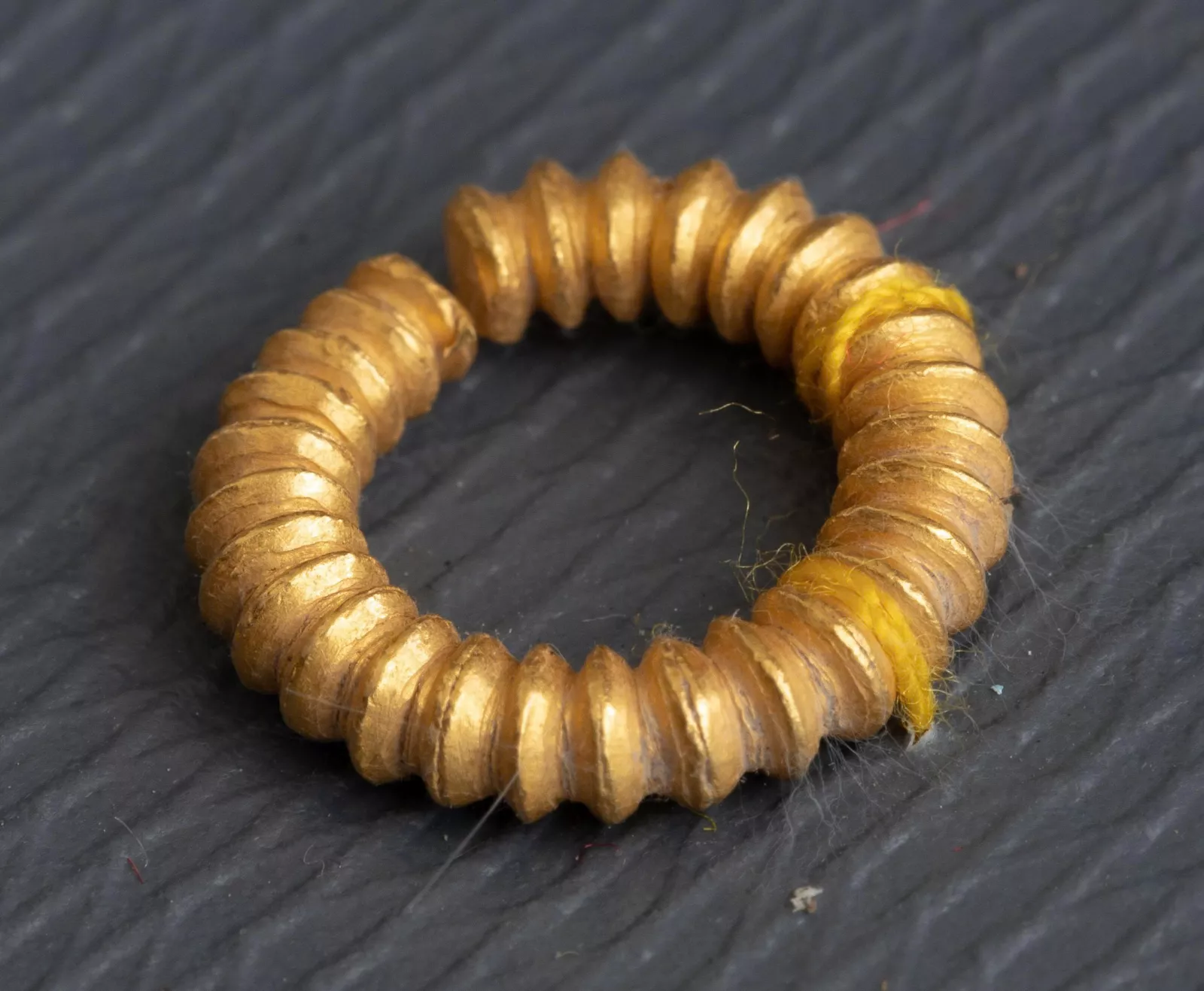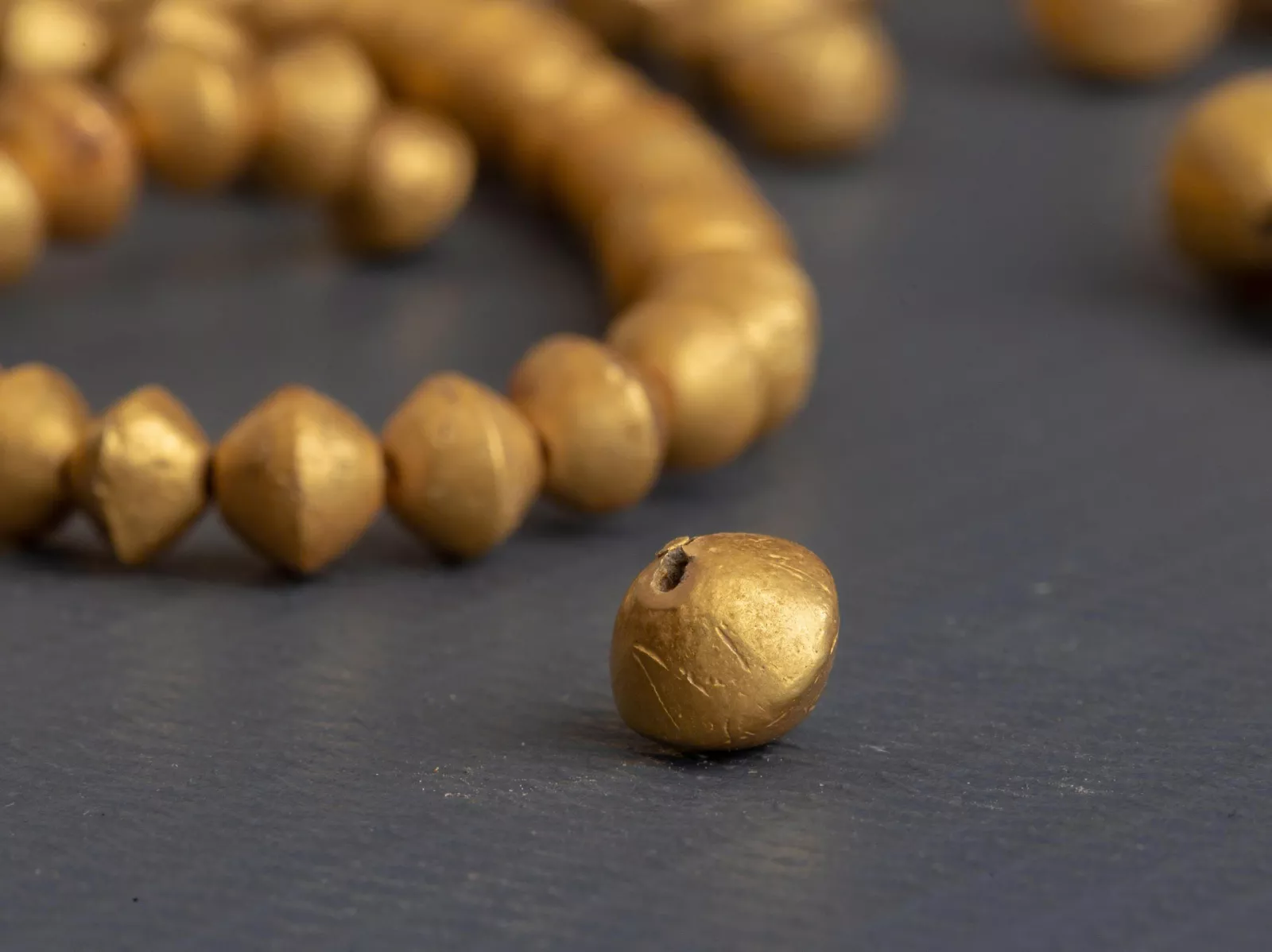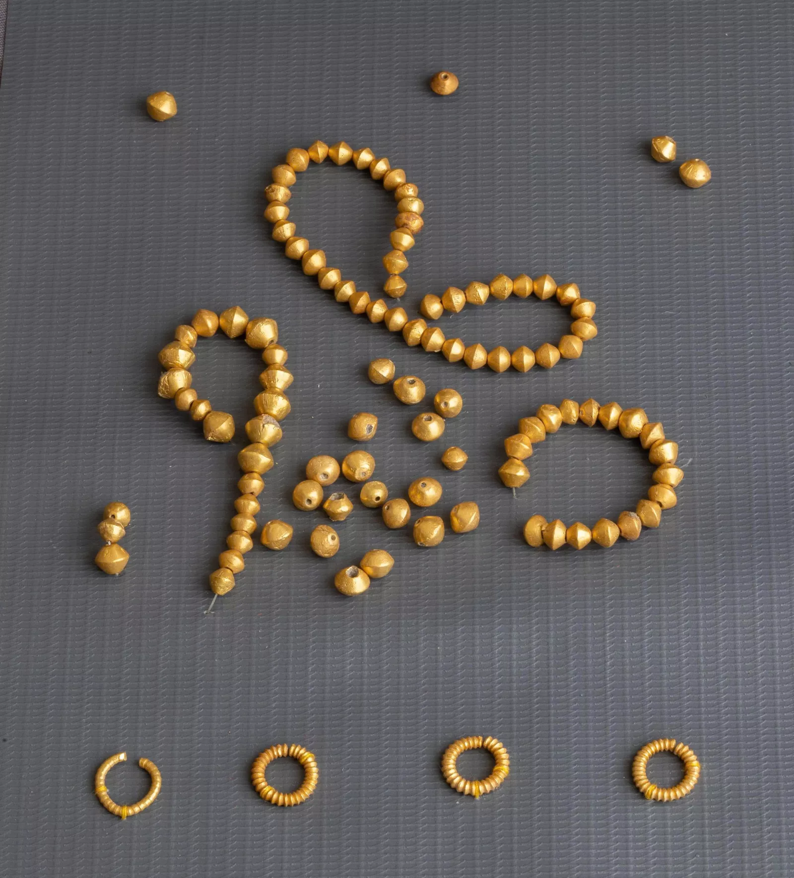 Nhóm khuyên tai gồm 4 khuyên tai chất liệu vàng, tiết diện hình tròn, toàn thân có ren xoắn, có khe hở ở thân. Nhóm hạt chuỗi gồm 104 hạt chuỗi vàng có hình dáng như hai hình nón cụt úp vào nhau, chính giữa thân nối thành đường gờ, hai đầu phẳng và có lỗ xuyên dọc thân. Các hạt chuỗi vàng hoặc dát vàng có thể được làm bằng phương pháp dập khuôn bao ngoài, dập lỗ bên trong tạo thành hạt chuỗi rỗng ruột,…